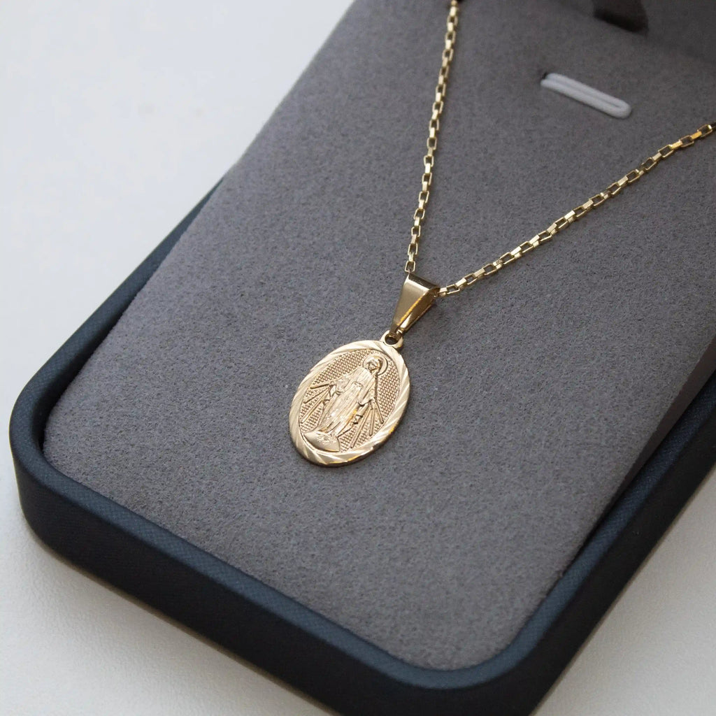 Presenteie elegância e espiritualidade com nosso Conjunto Nossa Senhora das Graças. A corrente banhada em ouro 18k é delicada e sofisticada, enquanto o pingente de Nossa Senhora das Graças é um símbolo de proteção e fé. Uma combinação perfeita para um look luxuoso e significativo.