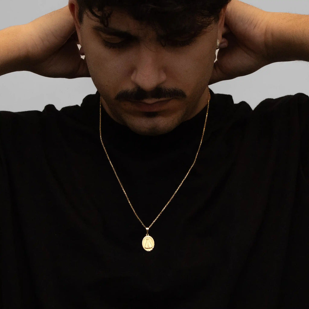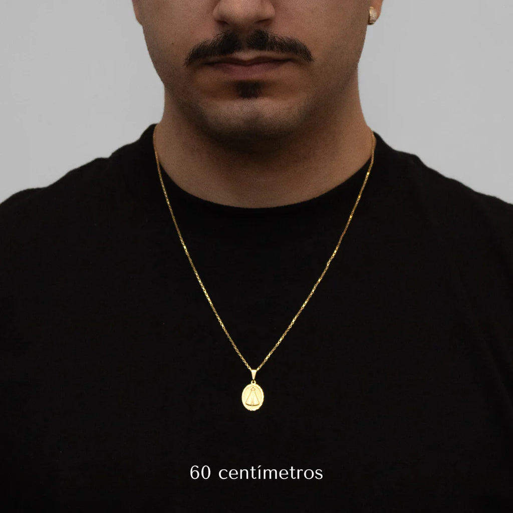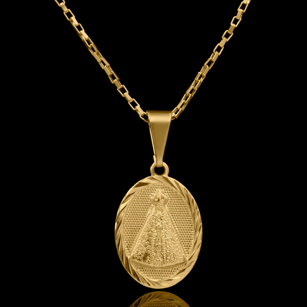 Eleve seus acessórios com a Corrente Tijolinho Banhada a Ouro 18k, adornada com o encantador Pingente de Nossa Senhora Aparecida. Feita com material de alta qualidade e detalhes delicados, essa peça traz sofisticação e devoção ao seu look. Um toque de luxo para sua coleção.