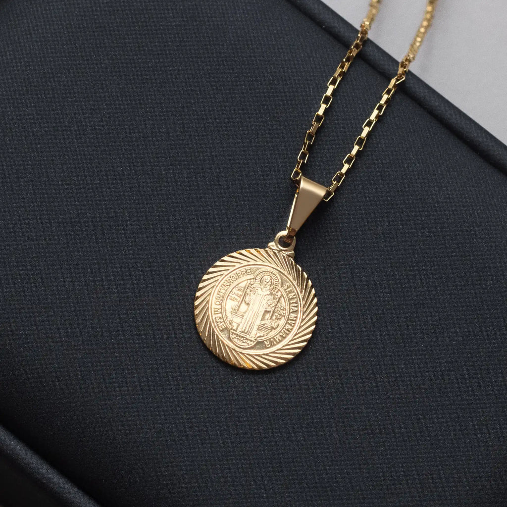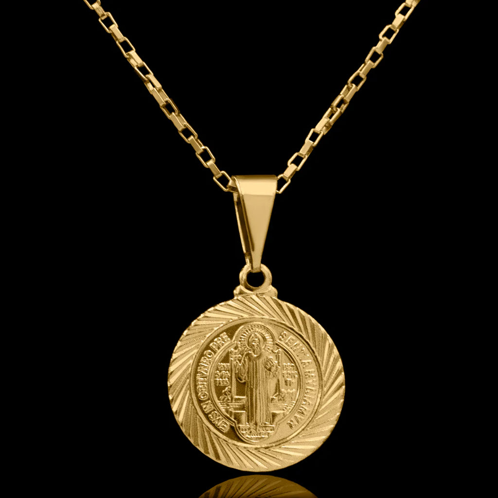 Sinta-se protegido com a elegante corrente tijolinho 1mm com pingente São Bento II banhado a ouro 18k. O design exclusivo traz a proteção e a sofisticação da fé em uma única peça. Ideal para adicionar um toque de luxo e estilo ao seu look.