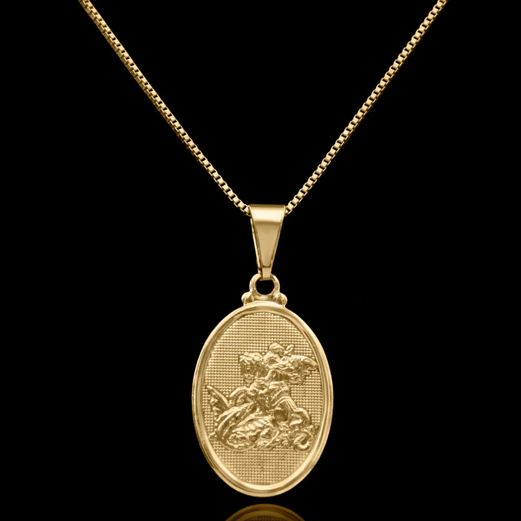 A corrente masculina Veneziana 1mm, combinada com o pingente Oval de São Jorge, é banhada a ouro 18k, garantindo brilho duradouro e acabamento refinado. Seu design delicado, mas robusto, realça elegância e proteção, perfeita para quem aprecia joias com significado e estilo atemporal.