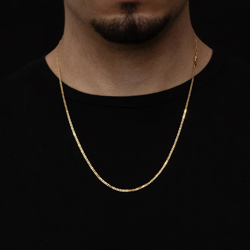 Adicione elegância e sofisticação com a corrente modelo Mariner de 2mm. Uma jóia minimalista de alta qualidade banhada a ouro 18k.