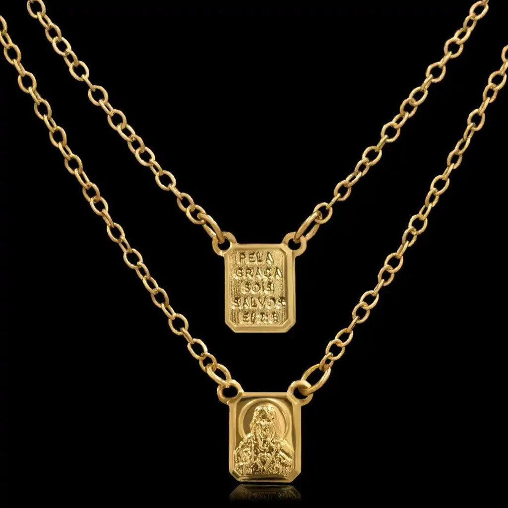 Mostre a sua fé com o Escapulário Jesus e Efésios Banhado a Ouro 18k. Um acessório que alia estilo e religiosidade para te acompanhar em todos os momentos da sua vida.