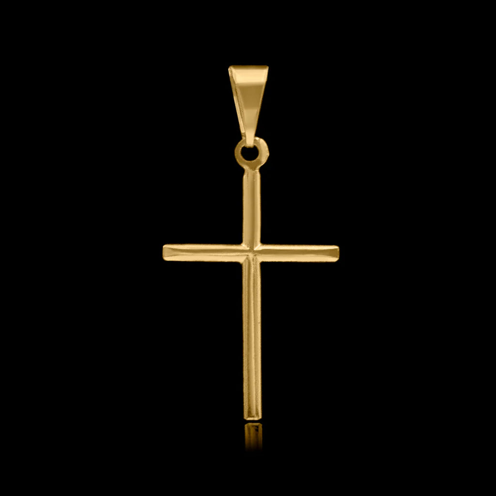 Elegante pingente em formato de cruz lisa, tamanho pequeno, meticulosamente banhado a ouro 18k. Esta peça masculina combina simplicidade refinada com acabamento premium, oferecendo um toque de distinção ao visual cotidiano ou para ocasiões especiais. Um símbolo atemporal que expressa fé com sofisticação discreta.