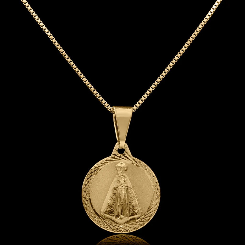 Este elegante conjunto combina una delicada cadena veneciana y un refinado colgante de Nuestra Señora de Aparecida, ambos bañados en oro de 18 quilates. Ideal para quienes aprecian los accesorios con significado espiritual y acabados sofisticados, realza cualquier look con encanto y protección, combinando tradición y estilo en una pieza única.
