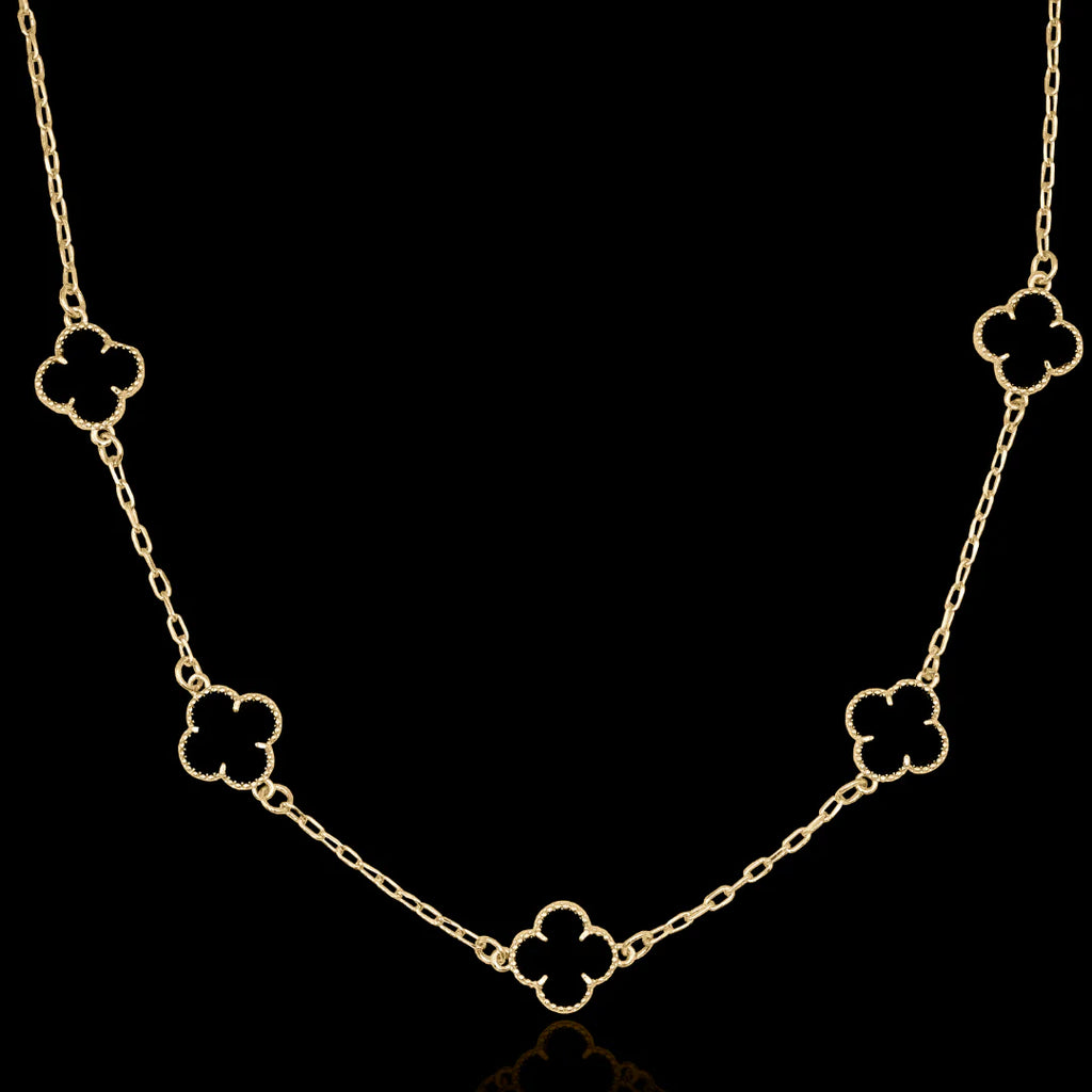 Descubre la elegancia de la Cadena Negra 5 Tréboles, bañada en oro de 18 quilates para un acabado sofisticado y duradero. Su exclusivo diseño de cinco tréboles simboliza suerte y protección, realzando cualquier look con un toque moderno y refinado. Ideal para quienes valoran el estilo y la calidad en cada detalle.